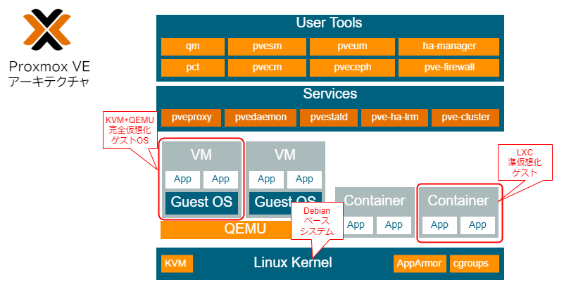 実態としては Debian Linux ベースのディストリビューションに近い。Linux KVM (完全仮想化) の他、LXC コンテナ (準仮想化) も併用できる。