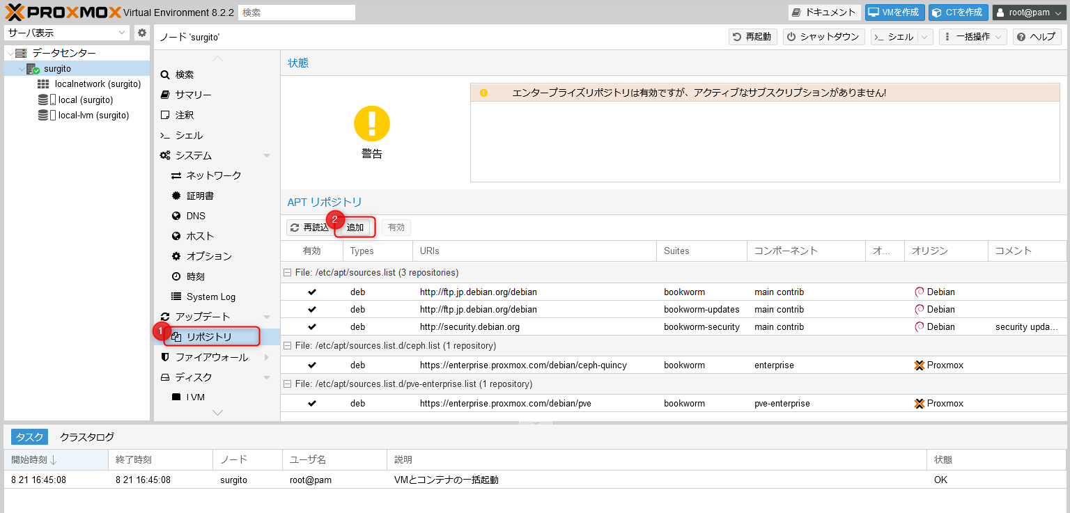 左メニューでホストを選択 → ノードメニュー [リポジトリ] → [追加] ボタン