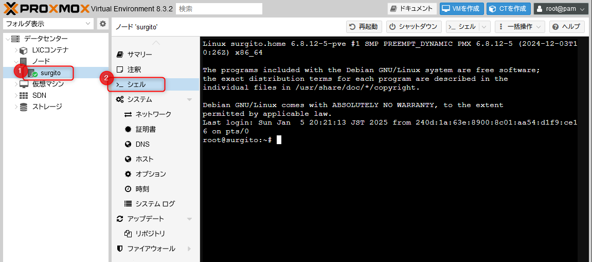WebUI で、ノード名 → [>_ シェル] でコンソールを開く