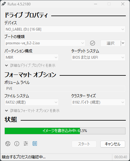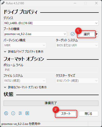 Rufus で、Proxmox の ISO ファイルを [選択] し、[スタート]