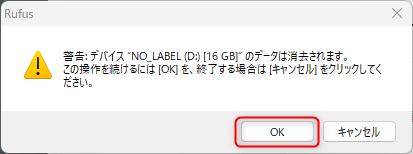 ISO ファイルを選択した際に DD イメージモードで書き込む旨の確認が出る [OK]