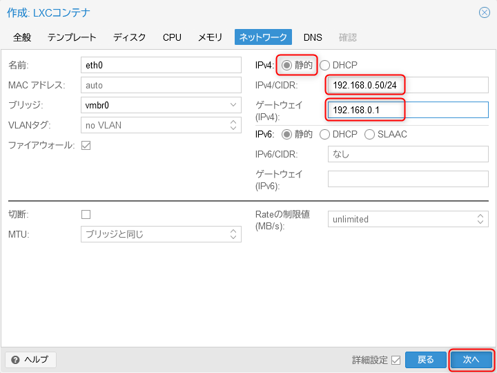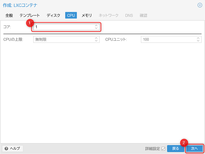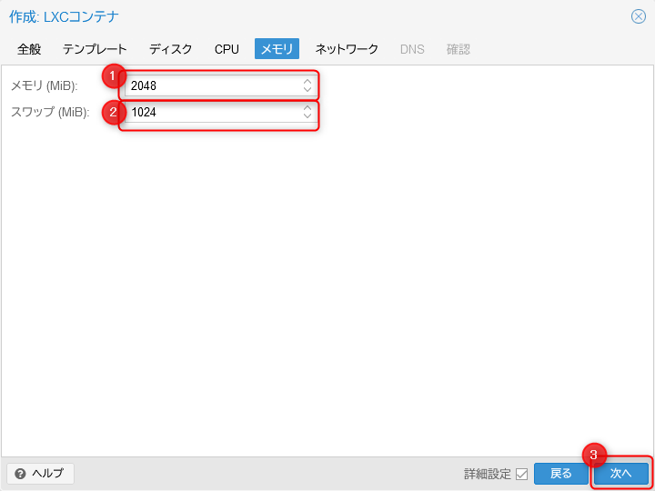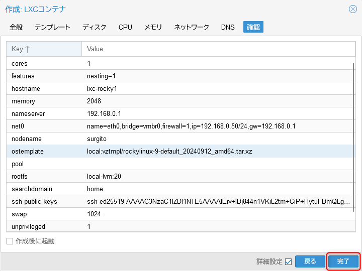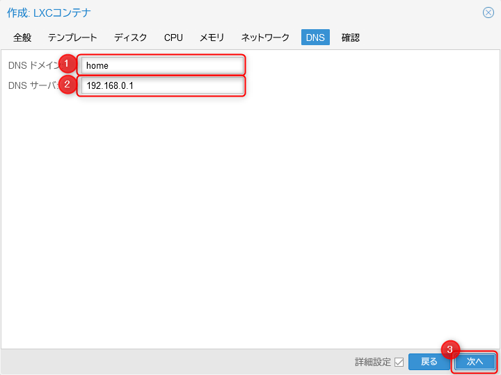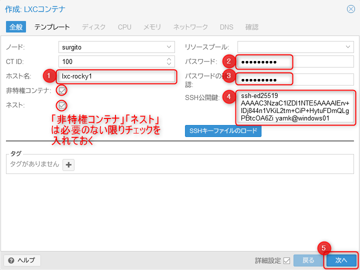 「作成: LXCコンテナ」ウィンドウにパラメータを入れてゆく。