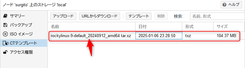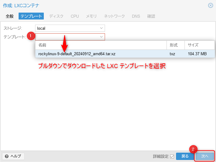 プルダウンして、ダウンロードした Rocky linux のテンプレートを選択