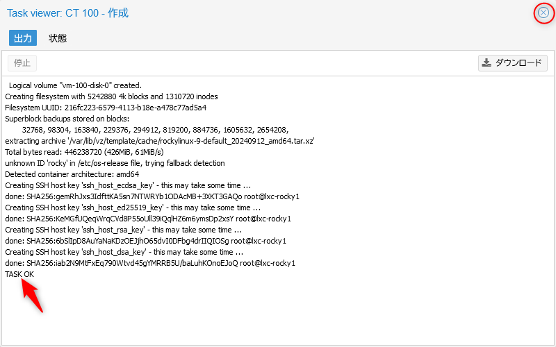 上記 コンテナ作成(WebUI版) での作業を、Proxmox VE の linux CLI から直接実行することもできる。