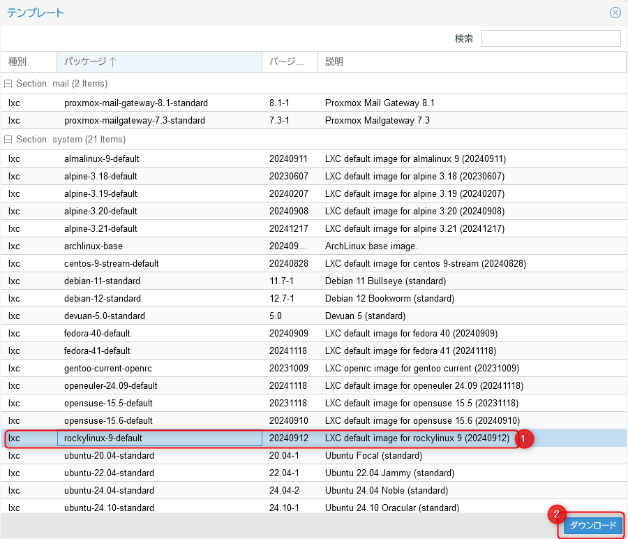 ここでは rockylinux-9-default パッケージを選択し、[ダウンロード] をクリック。