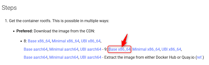 例: 9: Base_x86_64 https://dl.rockylinux.org/pub/rocky/9/images/x86_64/Rocky-9-Container-Base.latest.x86_64.tar.xz