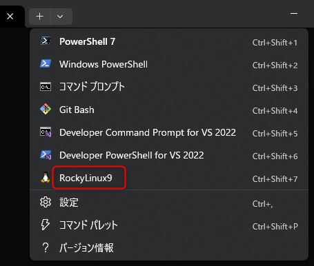 Windows Terminal は WSL にネイティブ対応しているので、上記のディストリビューション登録後、Windows Terminal 再起動後には RockyLinux9 というメニューが自動的に現れる。Windows Terminal の設定ファイルにも自動的に追加されているのがわかる。