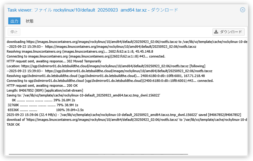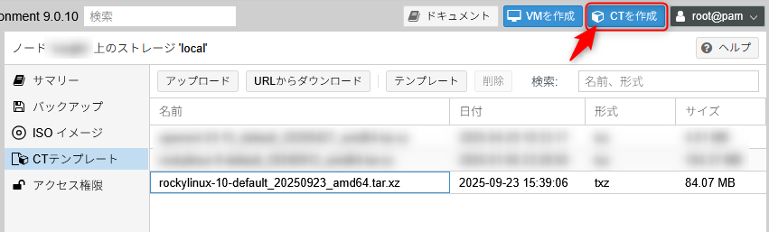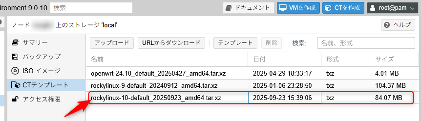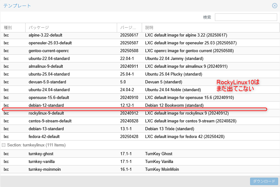 2025/9/23 現在、Rocky Linux 10 のテンプレートファイルは Proxmox VE のCTテンプレート一覧には出てこない。