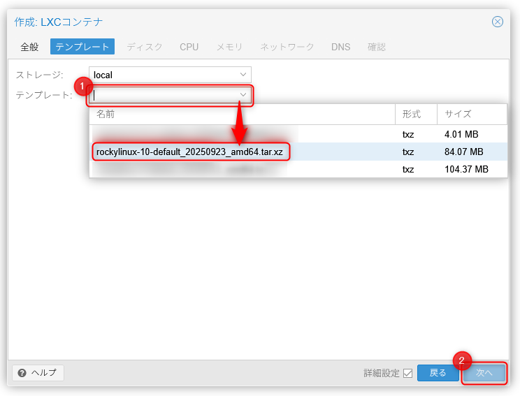 プルダウンして、ダウンロードした Rocky linux のテンプレートを選択