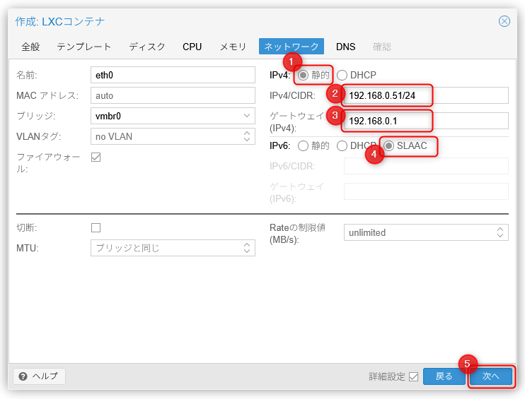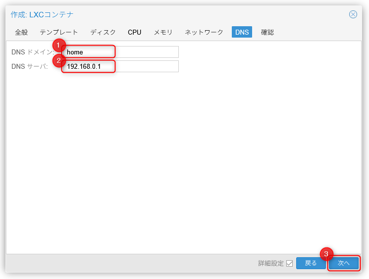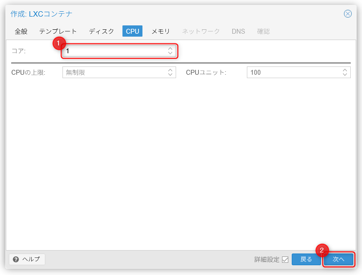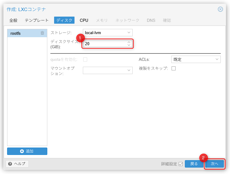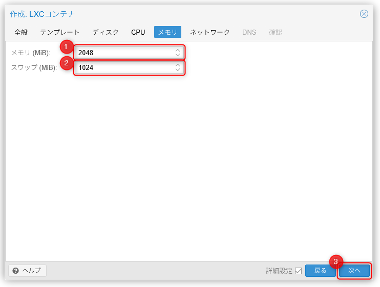 「作成: LXCコンテナ」ウィンドウにパラメータを入れてゆく。