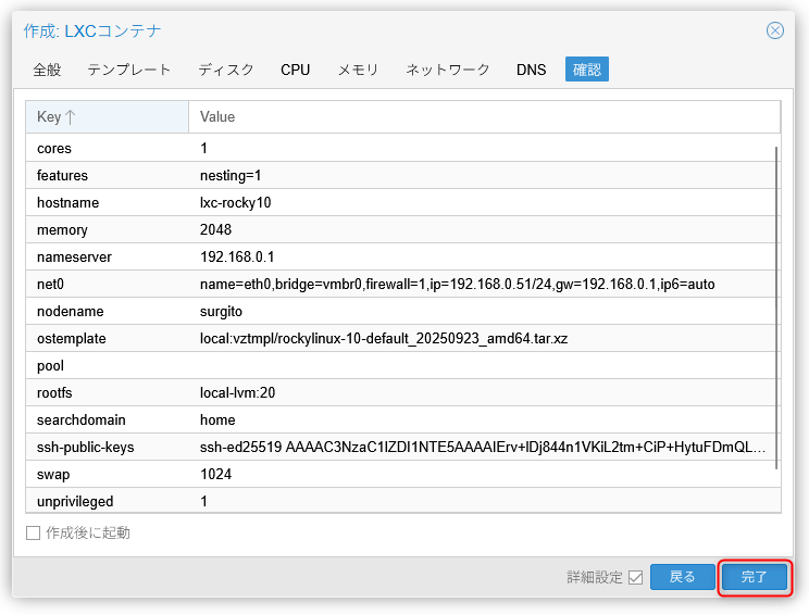 - 「ネスト」は、非特権コンテナに於いて内側で Docker 等の準仮想サービスを立てる際に必要。チェックを入れたままでよい。