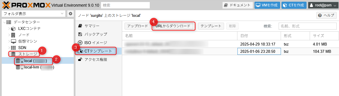 LXC テンプレートをProxmox VE ストレージへダウンロード