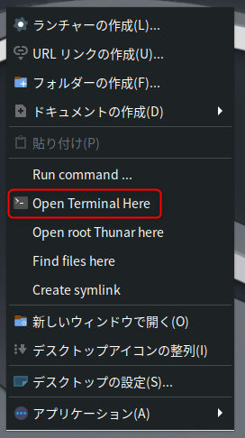 - MX Linux にログインしたら、右クリックでターミナル起動 (Open Terminal Here)