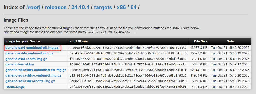 実際のファイル名は openwrt-24.10.4-x86-64-generic-ext4-combined-efi.img.gz という感じになる。