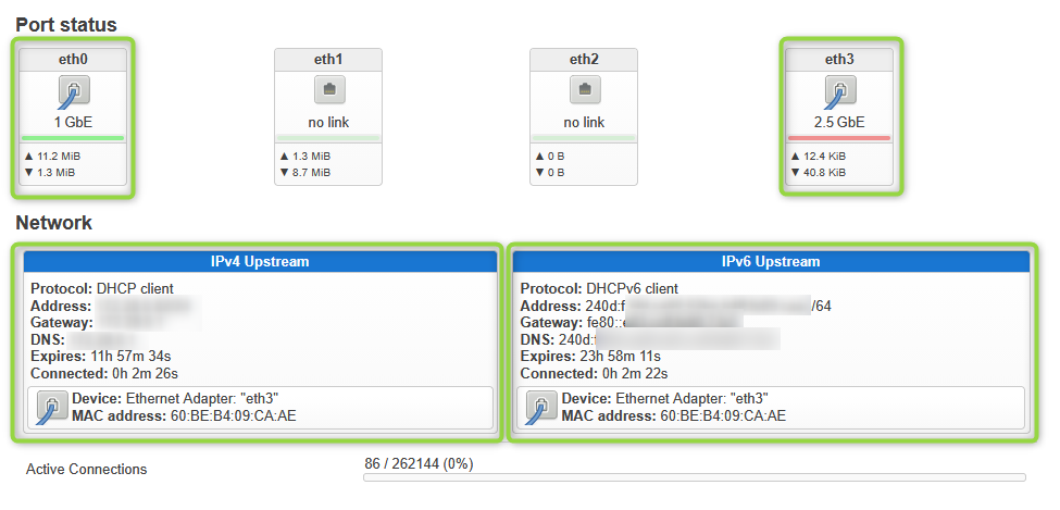 下にスクロールして、物理ポート eth0 / eth3 がリンクアップしていること、WAN 側のアドレスが自宅/社内 IPv4 DHCP / IPv6 SLAAC 等から取得できていることを確認。画面の例では、自宅環境の IPv6 Upstream も自動設定されている。