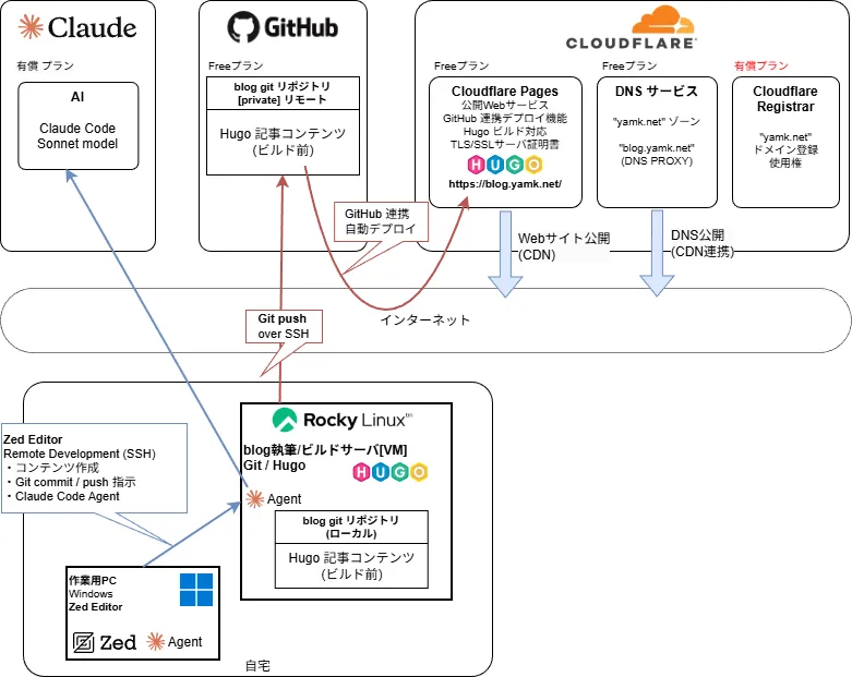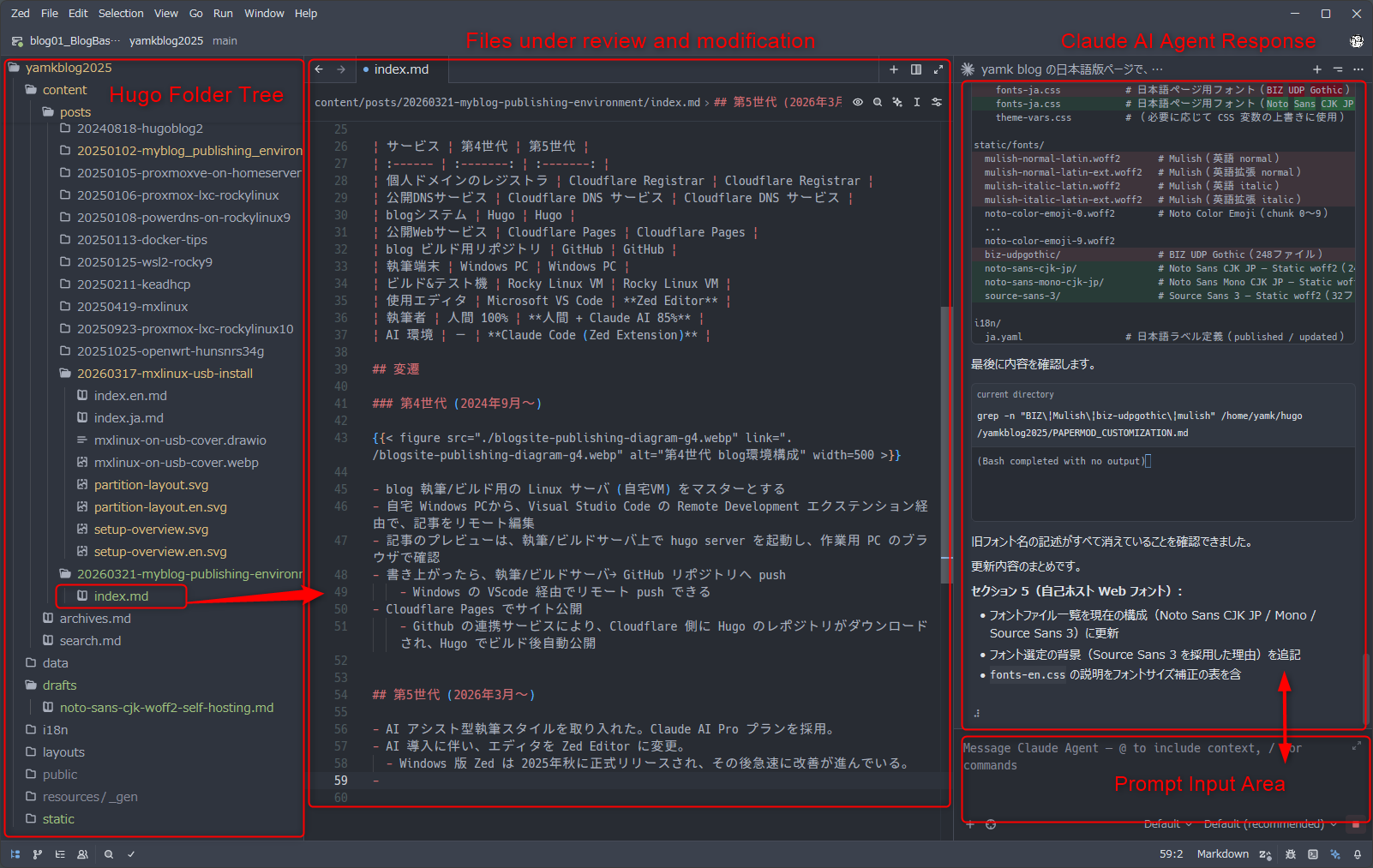 - Zed + Claude Agent (Claude Code) での blog 執筆イメージ