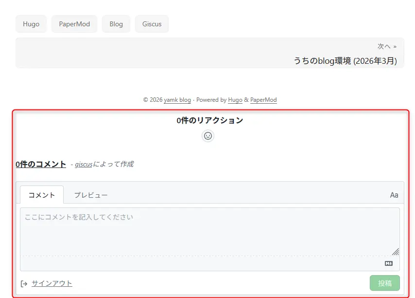 記事ページ末尾にコメント欄が表示されれば成功。hugo server のローカル環境でも giscus はそのまま動作確認できる。
